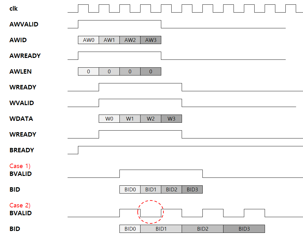 • Whilst WLAST is not shown in your diagram, I have assumed it is high for each of the WDATA transfers as AWLEN is 0 (1 beat) for each ID.