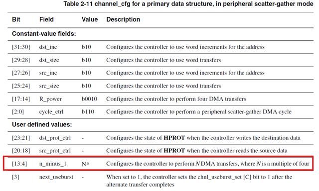 In uDMA controller specification (pl230), Table 2-11It is mention that value of N should be multiple of four. But DMA will perform N+1 tranfer ex. if N=4 dma will perform 5 transfer. In scatter-gather mode dma uses primary data structue to configure alternate data structure, and number of transfer for primary should be multiple of four. So here value of N should be 3, 7, 11, 15, etc. and not multiple of four. Can anyone please confirm this behaviour ?