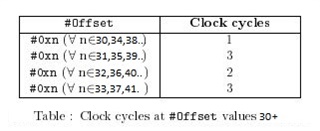 According to the mentioned table for offset value of #0x30(in hex = #0x1E), the clock cycle consumption should be 2 but on observation, I have found that for from offset value = #0x30 the clock cycles consumption is 1.