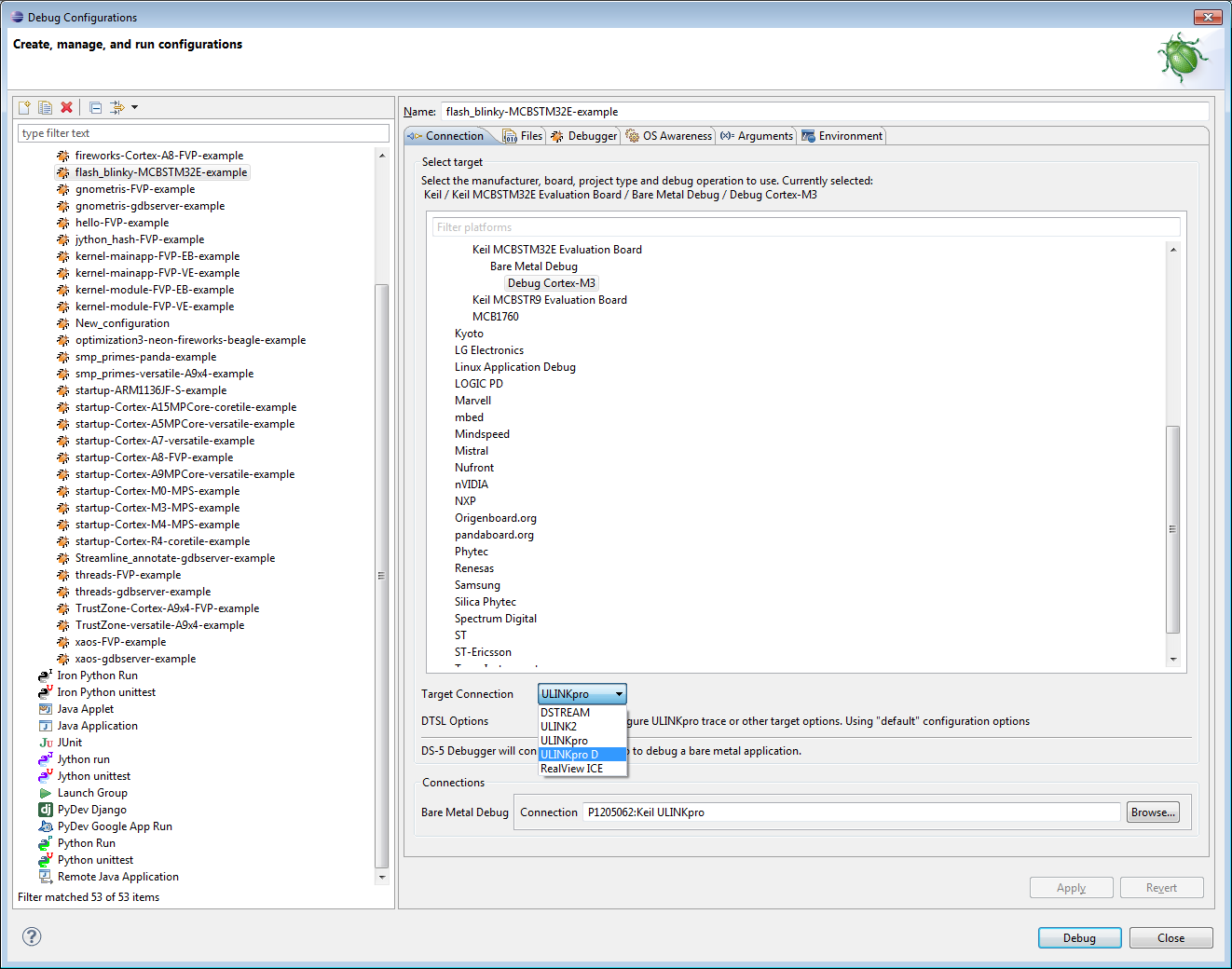 I have one more question. Without any connected probe, the popup menu in the debugger connection page displays only DSTREAM and RealView, and no ULINKpro. Is it a choice that appears only if a ULINK pro probe is actually connected to a USB slot? Or could it show that something is wrong in my DS5 installation (btw I did run the post-installer script)? I dont currently have a ULINKpro probe (I'll try to get one asap), so I have to rely on someone else's experimentations.
