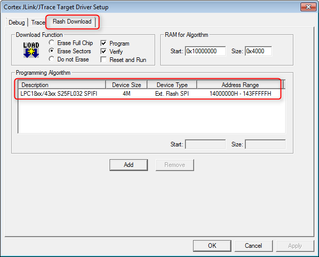 You are trying to flash from address 0x0. As you can see from your own screenshot, there's no algorithm for that address. Have you made sure that you are using the correct RAM/ROM settings in the Options for Target dialog? On the target tab, the settings should look like this: