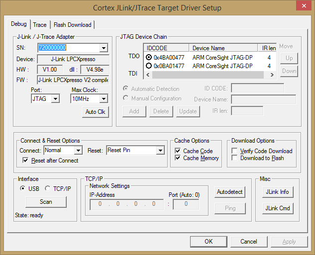 I still cannot read the JLINK version number, from the JTAG Device Chain panel, in the Debug tab from Debug Settings.