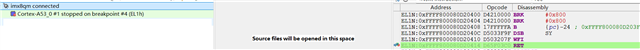 Execution stopped in EL1h mode at breakpoint 4: EL1N:0xFFFF800080D20414EL1N:0xFFFF800080D20414 RETWARNING(DTS51): Failed to complete manual flush (FOnMan stayed high in FFCR)WARNING(DTS50): Failed to stop formatter (FtStopped bit stayed low in FFSR)WARNING(DTS286): STS.TMCReady stayed low