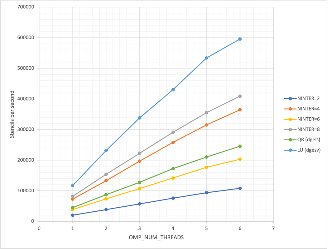 So the batch QR delivers almost 2x speed-up with NINTER=8, which I guess is the best we can expect with the 128-bit vector length. I did manage to improve the performance of the LU variant, which is now the fastest (also thanks to ArmPL!). As mentioned earlier, due to pivoting reasons, I cannot use the batched LU routines. But I do a have a different problem where the matrices aren't square, so the batched QR will be the right one.Here's a plot of the multi-threaded scaling of the outer loop over systems: