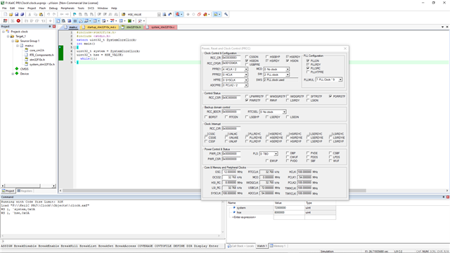 I am using the startup file in Keil. However, when I run the simulation in the debugger, my system clock (SYSCLK) is not 72 MHz, even though I have confirmed that HSE_VALUE is set to 8 MHz. Can someone help me figure out why the SYSCLK is incorrect during simulation? I am using stm32f103c8t6 bluepill