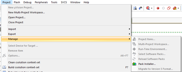 I am using uVision 5.43 with a csolution and associated cproj file from a vendor's example application. I open the solution using the Project Menu. I am able to build/program as normal, but now I want to add files to my project and start developing my own code. When I use Project->Manager, everything except the Pack Installer are grayed out.
