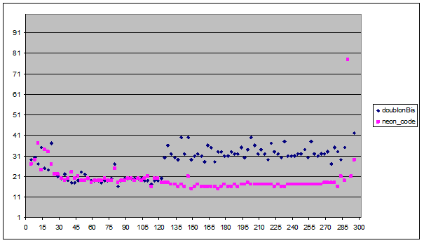 So, here are the result betwwen the 2 functions. "doublonBis" my version in bleu and the peter code "neon_code" in red.